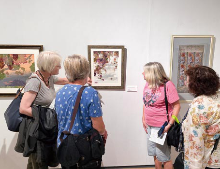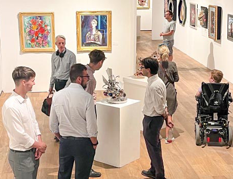先日、崩御なさった女王エリザベス2世の即位70周年を記念する「プラチナ・ジュビリー」で祝賀ムードだったロンドンで、8月24日、本展の開会を祝したセレモニーが開かれ、会場にお越しになった英国王立美術家協会(RBA)会長のミック・デイヴィス氏を始めとする10名のボードメンバーに作品をご覧いただきました。