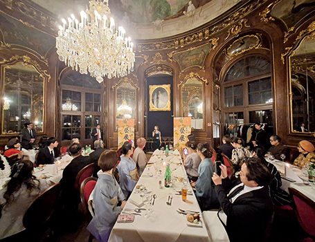 展覧会初日に実施されたオープニング・セレモニーでは、宮殿の統括本部責任者フロリアン・フェルダー氏、在オーストリア日本国大使館広報文化センター所長・菅谷亜紀氏、オーストリア貴族でEU設立にご尽力されたクーデンホーフ・カレルギー家のロレンツ・クーデンホーフ・カレルギー氏より、歓迎と盛会祈念のお言葉を頂戴。夕刻からは、女王マリア・テレジアやその娘、王妃マリー・アントワネットをはじめとする皇帝一家の朝食用に建てられた、エンペラーズ・パビリオンにてレセプションパーティーが行なわれました。